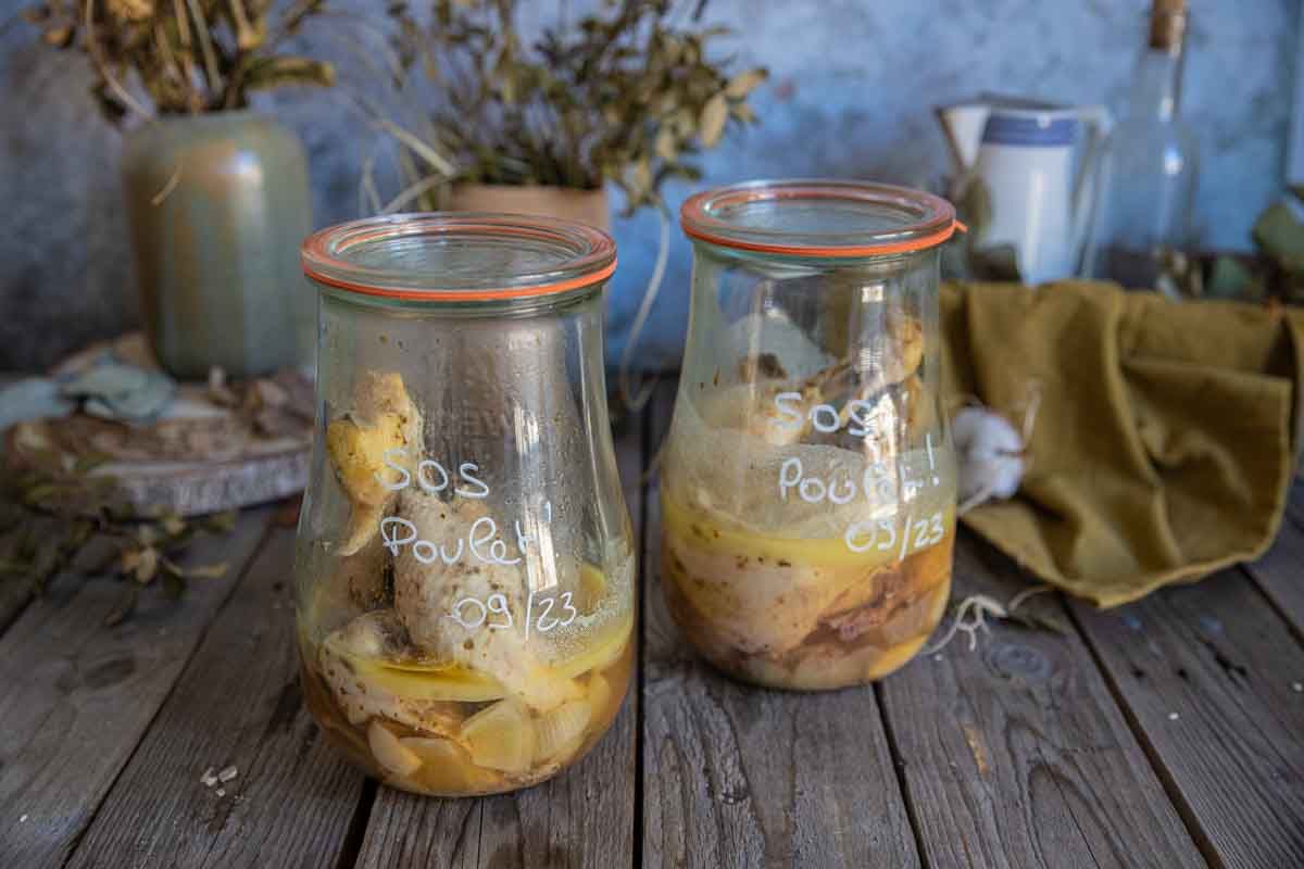 Ces bocaux de cuisses de poulet sont idéaux pour des pique-niques, pouvant se déguster froid ou réchauffés en quelques minutes. Pour une idée de service, ajoutez-les à des légumes rôtis pour un plat complet et savoureux !
