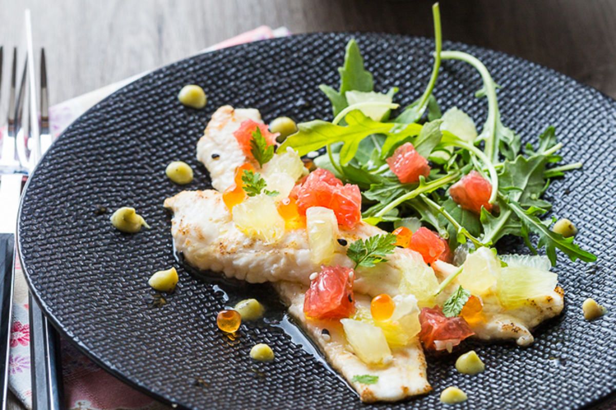 - Dressez les assiettes avec le poisson, les dés d'agrumes, et profitez de la vinaigrette accompagnée de points de purée d'avocat.