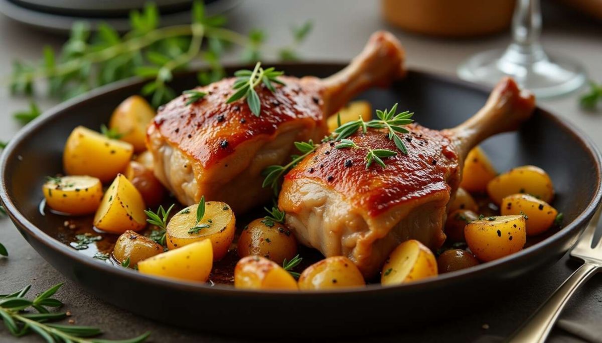 Les cuisses de canard accompagnées de pommes de terre au four sont un incontournable de la gastronomie française. Mariant simplicité et saveurs audacieuses, ce plat chaleureux invite à la convivialité, idéal pour rassembler vos proches autour d'une table festive.