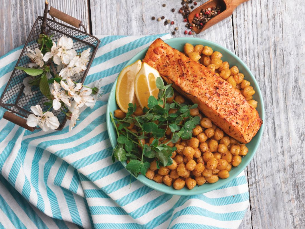 Pour le menu, optez pour un saumon rôti accompagné d'une sauce au yaourt et à l'aneth pour ses propriétés probiotiques, servi avec des pois chiches fumés au paprika et des légumes verts. Vous pouvez ajouter une céréale complète comme le riz sauvage, l'orge ou le quinoa. Ce repas, riche en oméga-3, contient des aliments anti-inflammatoires et de la capsaïcine (présente dans le paprika), reconnue pour stimuler la croissance de bactéries saines dans le colon.