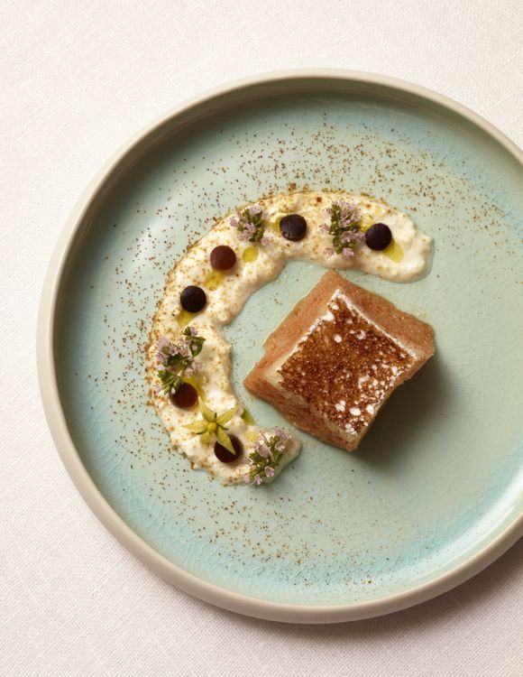 Pour finir, dans une assiette, tracez un trait de burrata mixée, assaisonnez, ajoutez les feuilles d’origan, puis disposez les rondelles d’olive. Parsemez de poudre de tomates et déposez le carré de focaccia au centre, que vous garnirez d’anchoïade devant vos convives.