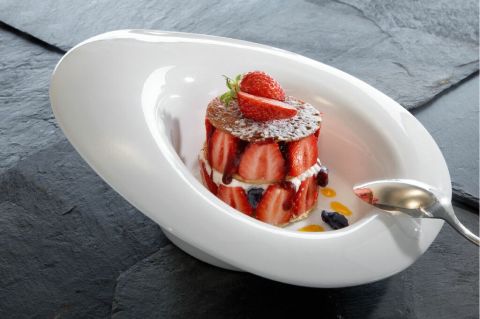 - Assemblage : placez un sablé breton sur une assiette, entourez de fraises, ajoutez de la crème au centre et nappez de coulis de fraises. Terminez avec un rond d’arlette et, si désiré, un peu de crème et une cuillère de sorbet.