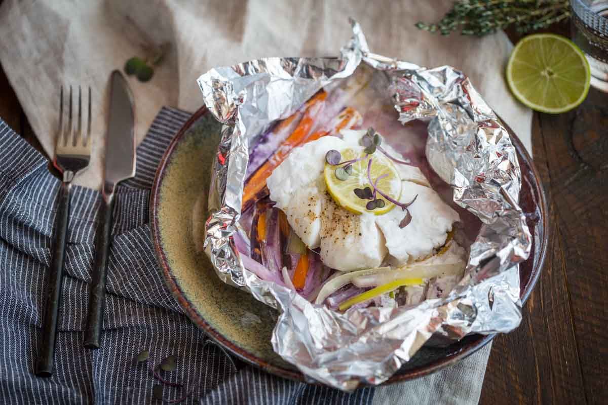 - Répartissez les légumes dans des sacs à papillote en ajoutant un pavé de cabillaud et une rondelle de citron vert. Assaisonnez avec du sel et du poivre, puis arrosez d’un filet de lait de coco.
