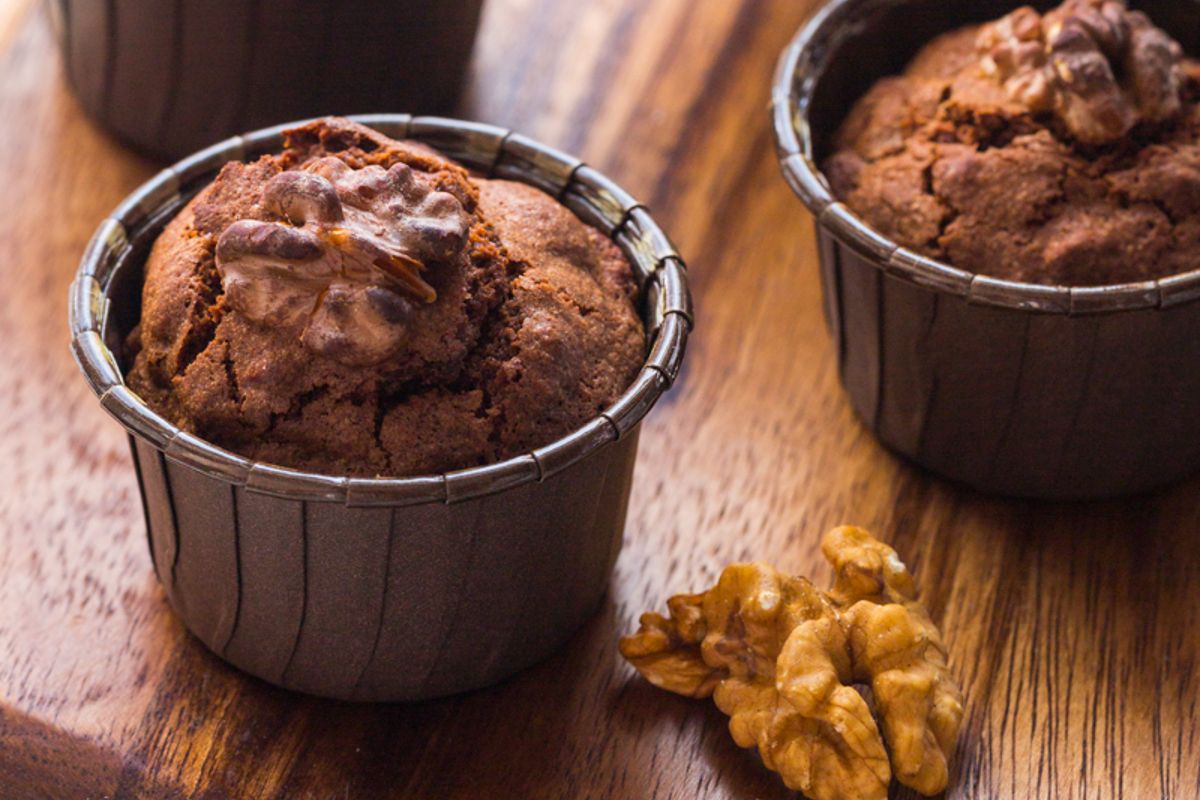 Remplissez des caissettes à muffins aux ¾ et disposez un cerneau de noix sur chaque brownie avant de les enfourner pour 15 minutes.