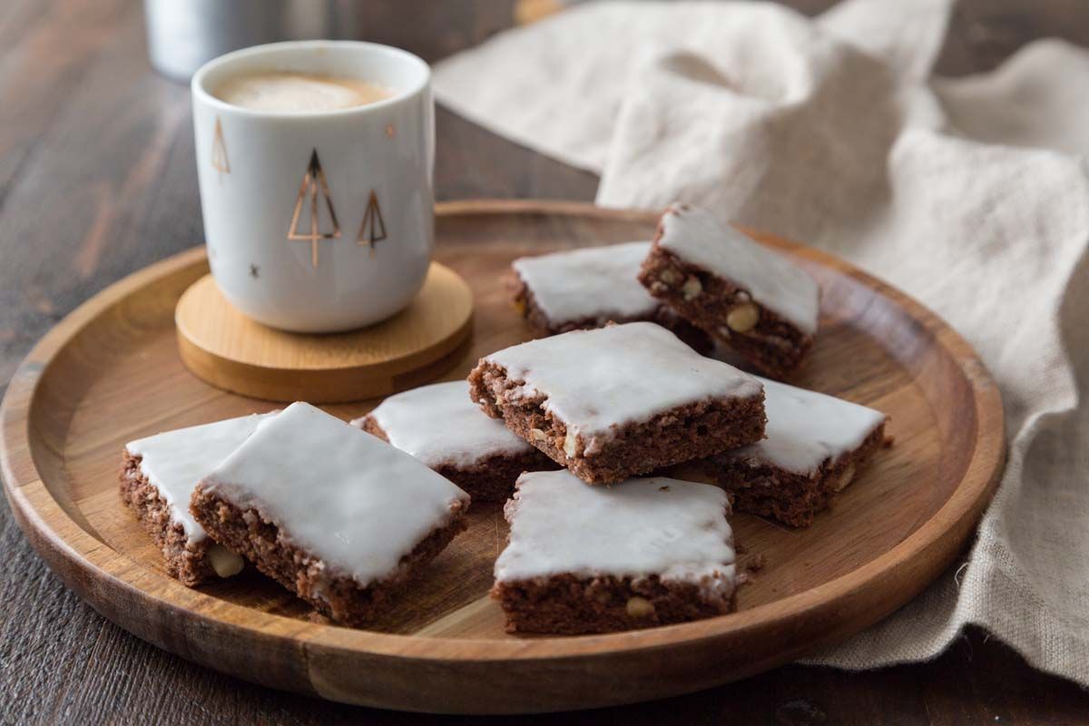 - À la sortie du four, laissez tiédir légèrement, nappez de glaçage, découpez en carrés et laissez refroidir complètement.