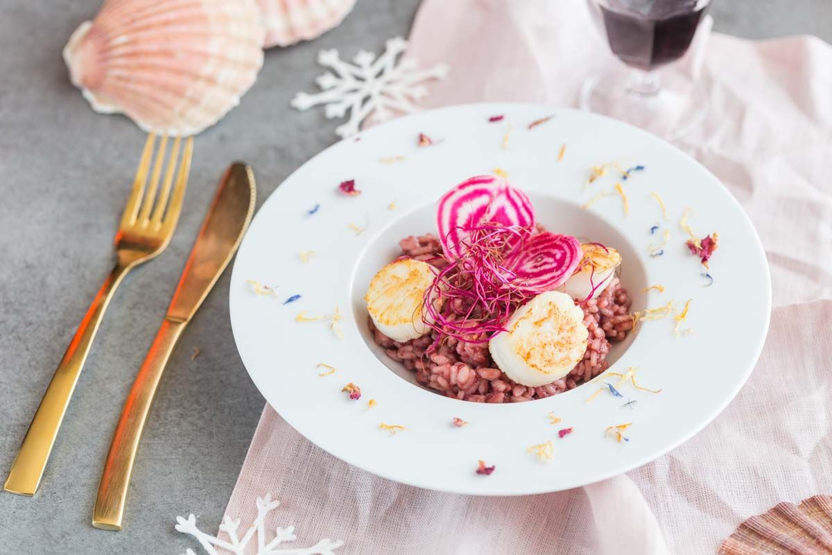 - Servez le risotto chaud dans des assiettes creuses, garnissez avec les noix de Saint Jacques et des graines de betterave germées, si désiré.