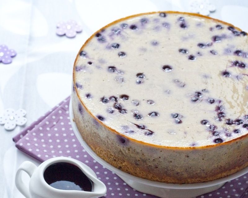 - Incorporez délicatement les myrtilles à la préparation, puis versez le tout sur la base de biscuits. Enfournez pendant 15 minutes, puis réduisez la température à 120°C et prolongez la cuisson de 50 minutes. Éteignez le four et laissez le cheesecake refroidir lentement à l’intérieur, avant de le placer au réfrigérateur pendant 24 heures avant dégustation.